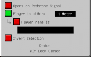 To change the settings of the controller, right-click on it to bring up its GUI. In the GUI you will see that you can customize how the door opens. Click on the red boxes to enable that particular setting. You can also click on the black drop-down box to change how close a player must be for the door to open. There is even an option to restrict who the door will open for by inserting the user's name. This is also where you select if the door is supposed to function vertically or horizontally (not pictured).