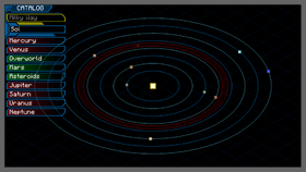 The Planet Selection Screen, also known as Celestial Catalog, is the screen where you select your target destination once you have lifted off with your rocket.